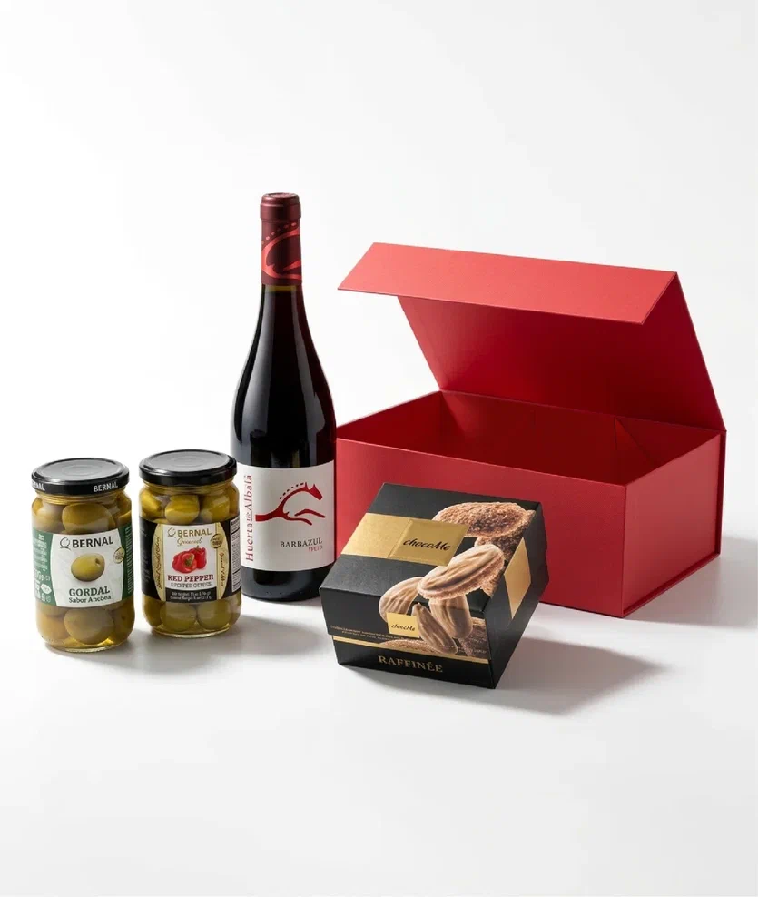 Набор из красного вина BARBAZUL, двух видов оливок и драже в шоколаде в подарочной упаковке