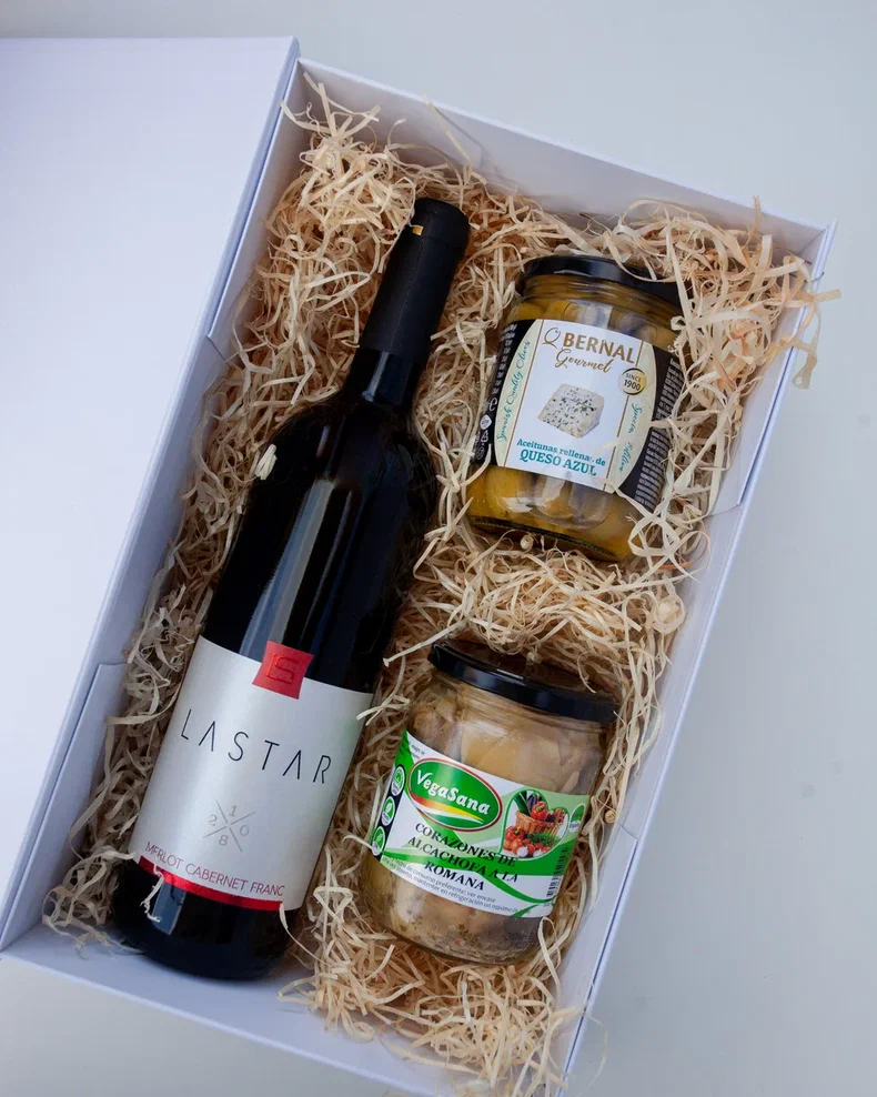 Набор из красного вина LASTAR, фаршированных оливок и артишоков по-римски в подарочной картонной коробке